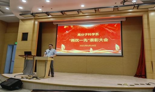 在党的百年华诞即将到来之际,6月29日下午,成人tv 党委隆重召开 “两优一先”表彰大会。校党委常委、校党委统战部长、化材学院院长赵东元院士出席大会并讲话,党史学习指导组阎嘉陵老师、系党委委员、全体教职工党员、学生党员代表出席大会,系党委副书记、系主任彭慧胜主持大会。