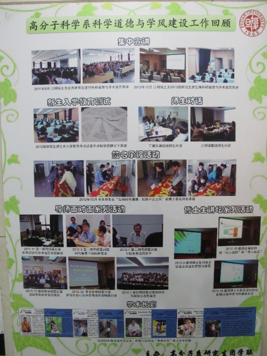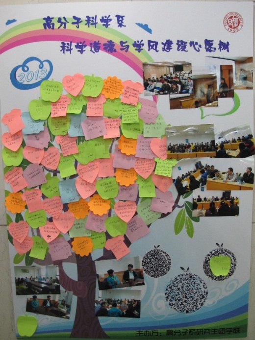自2011年以来,成人tv 重视在研究生中宣传科学道德与学风建设相关内容,陆续开展了集中宣讲教育、导师面对面、博士生讲坛、签名承诺等多项工作,在本次活动开展期间,研究生团学联也重点将过去的主要工作经验和亮点进行了整理和总结,制作了“成人tv 科学道德与学风建设工作回顾展板”,在跃进楼一楼大厅进行展示,引来了老师和同学们的驻足浏览,加深了此项工作的重要性。此外,研究生团学联以签名承诺树的形式,在全系师生中征集语录,寻访导师和研究生代表,在留言便签上写下对科学道德与学术规范的思考。