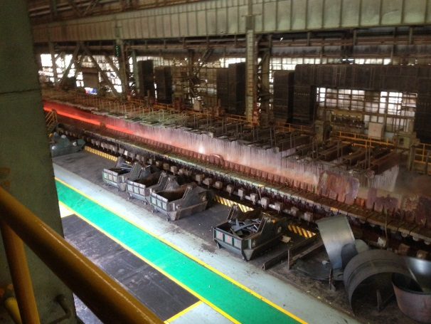 同学们在讲解员的引导下,依次登上6米多高的参观通道,在400多米长的通道上俯瞰热轧钢厂流水线的整个生产过程。因受热而放出红光的钢材在传送带上快速前进,机器的轰鸣声和冷却水的剧烈汽化声遮盖了同学们的阵阵讨论与惊叹声。通过近距离地接触,现代化工业生产的高效与雄伟深深地震撼了每一位在场同学的内心。