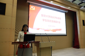 在庄严的国歌声中,大会正式开始。系党委副书记、学生党总支书记王芳代表上届学生总支委员会作《坚守立德树人初心,培育国家栋梁之才》的工作报告。报告主要从过去的主要工作回顾和新时代的发展目标与任务两大方面展开。系第一届学生党总支委员自成立以来,在学校、系党委的正确领导和支持下,坚守立德树人初心,牢记为党育人、为国育才使命,在基层党建、学生思想政治教育等方面取得了显著的成绩。在新时代要求下,学生党总支要提高工作站位,进一步加强政治核心作用;发挥示范引领,进一步推进党建工作标准化规范化建设;扎根学科特点,大力提升学生思政工作精准性和实效性,要传承复旦人、高分子人的红色基因,为把成人tv 高分子学科建成国内顶尖、国际一流的高水平学科,为实现高分子强国梦想而努力奋斗!