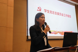图:王芳代表上一届学生党总支做工作报告 图:米震作大会筹备情况和新一届委员会候选人产生说明