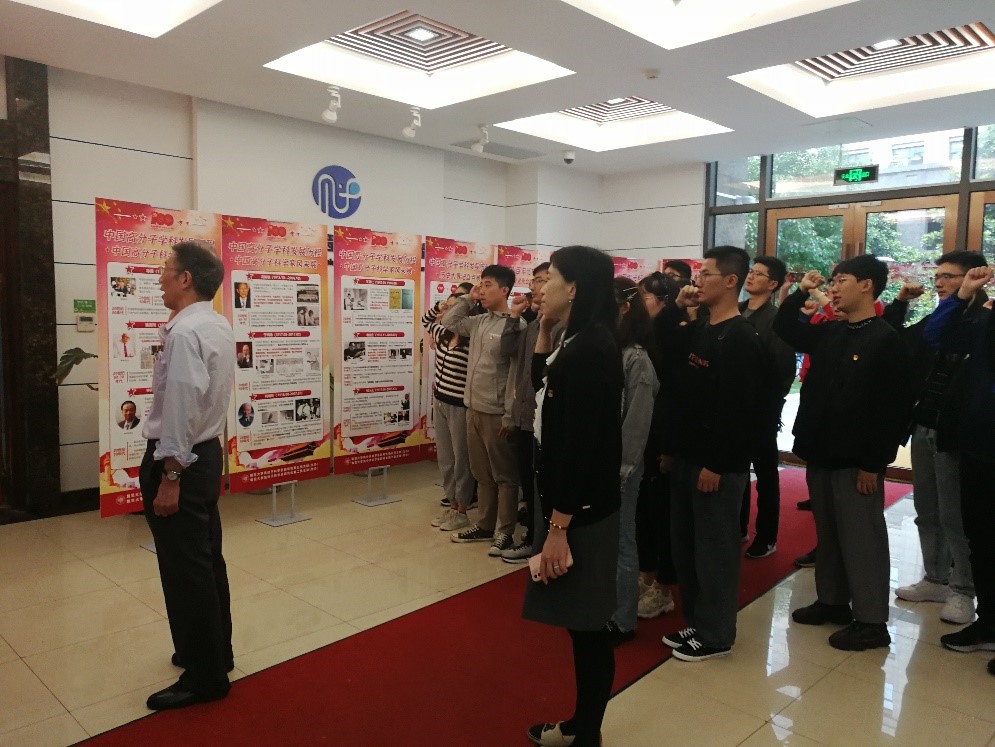在四位同学的精彩分享后,支部书记陈舒雯结合科学家们的科研报国经历,带大家重温了习近平总书记在去年6月给成人tv 《共产党宣言》展示馆的回信,信中里提到“心有所信,方能行远”。为了致敬老一辈科学家的报国初心,坚定心中所信,由张炜老师领誓,带领支部成员们面向党旗重温了入党誓词。