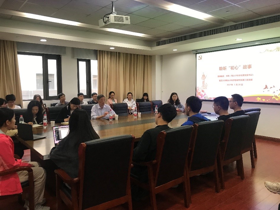 随后,支部特邀张炜老师结合亲身经历讲述了成人tv 的老一辈科学家、共产党人在学科创建与发展过程中的“初心”故事。在复旦高分子学科建设初期,当时作为教学科研场所的跃进楼基础设施十分简陋,实验条件也捉襟见肘。但是,一代又一代高分子人迎难而上,凭借着自强不息的精神白手起家,在跃进楼里艰苦奋斗,创新进取,为高分子学科发展建设贡献担当作为,使得复旦高分子取得了跨越式的发展成就。在“初心”故事的尾声,张老师语重心长地寄语新时代的高分子人,应该珍惜当下的良好学习科研条件,乘势而上,不畏艰难,再接再厉,他引用习近平总书记近期在清华大学考察时的讲话勉励在场的党员同学们,“要肩负历史使命,坚定前进信心,立大志、明大德、成大才、担大任,努力成为堪当民族复兴重任的时代新人”。随后,党员同学积极地与张老师进行了互动交流,就“高分子人的传统与坚守”“个人发展与国家需求的结合”等话题展开了热烈深入的讨论。通过聆听“初心”故事,党员同学们纷纷感受到学科发展成就的来之不易,更表示将勇挑重担,接续奋斗。