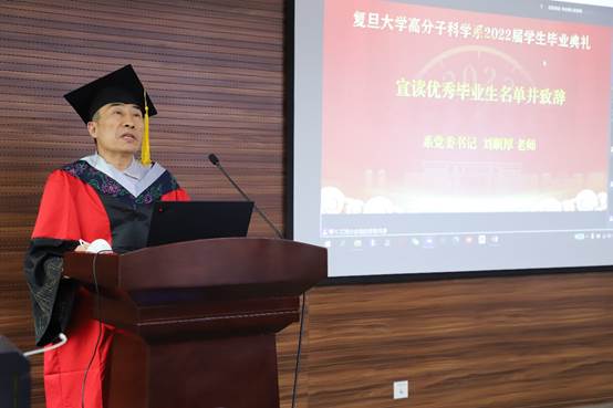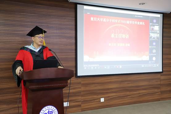 副系主任杨武利老师、冯嘉春老师宣读了2022届毕业生名单。路晨昊、时家悦、臧雨茗分别作为博士、硕士和本科毕业生代表分别发言。路晨昊刚刚荣获成人tv 第十三届研究生“学术之星”特等奖,他分享了在校学习与科研的努力与收获,并表示会始终铭记“要做顶尖的科研”的教诲,继续砥砺前行,在高分子领域开创新的未来。时家悦感谢导师的教导和学生工作给她带来的成长,希望能够将个人理想融入国家和民族的事业中,带着初心和梦想勇往直前。臧雨茗回顾了在高分子系的成长和蜕变。高分子系就像是一个条件适宜的反应釜,能够给予学生充分反应的良好环境,让同学们实现了从孤立分散、懵懂无知到凝心聚力、奔赴山海的聚变。