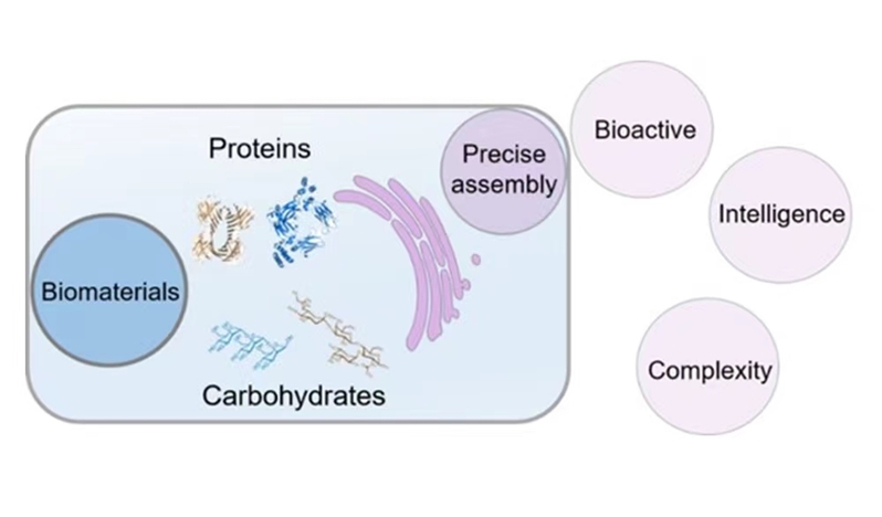 具有智能特性的下一代生物材料要求材料不仅能与生命系统共存,还要与生命系统相融合,这对于生物材料的构建基元提出了更高的创新要求。蛋白质和糖类的复杂性和多样性使它们能够成为精确组装的独特构建模块,所获得的精确生物大分子组装体具有纳米级精度、多维可控微结构、内源性生产、易于与活细胞整合、动态和层次化的特点,以及其固有的生物活性可以转导生物信号等诸多优势。同时,蛋白质和糖类的一些内在特性,如准确识别、自组织和适应性等,使得它们特别适用于设计并构筑与生命系统集成的新一代生物材料。