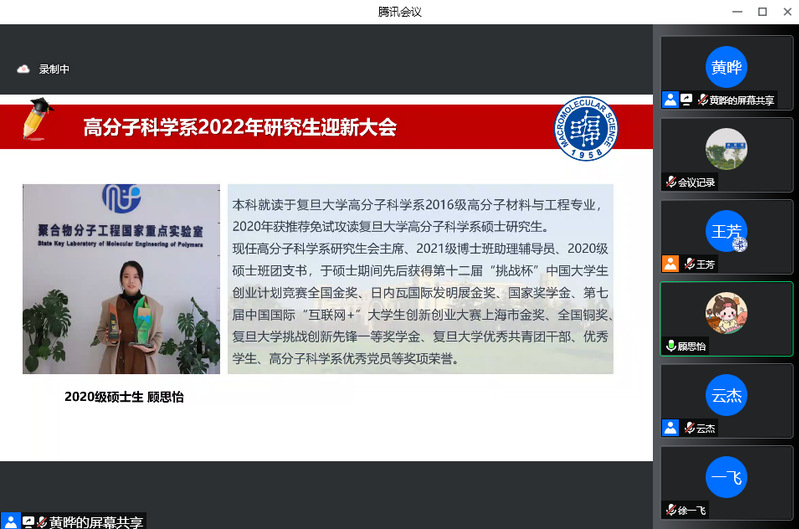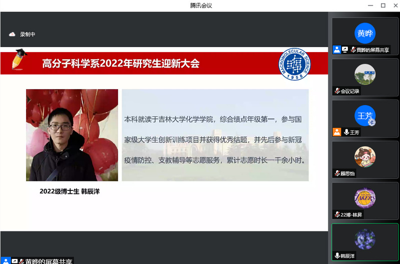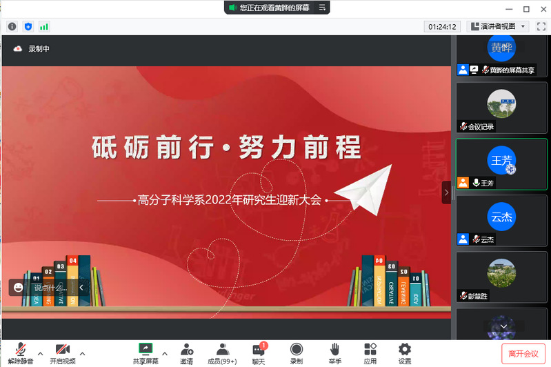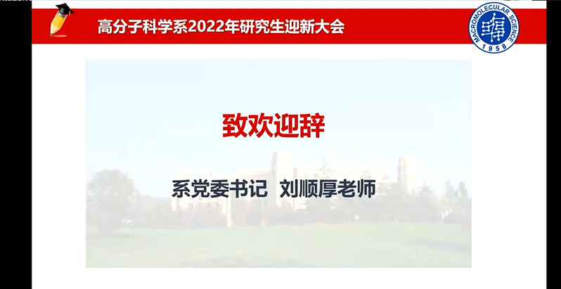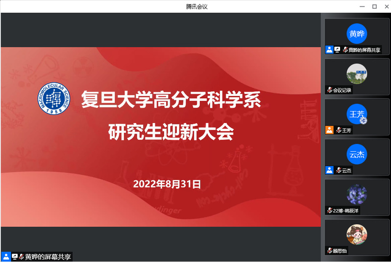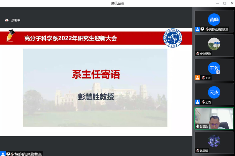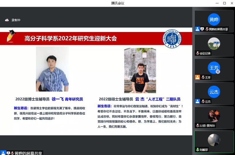 脚踏着青春的节拍,成人tv 迎来了128位2022级研究生新生。8月31日下午,成人tv 2022级研究生迎新大会以线上形式隆重举行。系党委书记刘顺厚、系主任彭慧胜、副系主任杨武利、冯嘉春、丛培红、研工组长黄晔、研究生教学秘书刘海霞、教务员张富瑛、新生辅导员徐一飞、云杰出席会议,系党委副书记王芳主持会议,共同与2022级研究生新生迎接新未来,启航新征程。