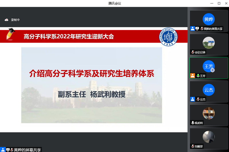 随后,副系主任杨武利老师介绍了成人tv 的系史和研究生培养体系。他首先为大家介绍了复旦高分子学科创始人于同隐先生和复旦高分子学科发展历程,到2023年,成人tv 成立30周年;接着,杨老师详细介绍了系里师资队伍、主要研究方向、聚合物分子工程国家重点实验室、共享仪器平台等建设以及国际合作与交流、专业课程体系与创新能力培养体系、高水平科研团队建设机制、国际视野下的基础前沿研究培养机制、基于理论指导实践的全链条融合创新等培养体制机制,还隆重介绍了一批优秀博士生、各种国际国内创新创业大赛获奖情况以及学术界和产业界优秀的校友们;最后强调了高分子系的人才培养模式,鼓励同学们要提高站位,开阔眼界。