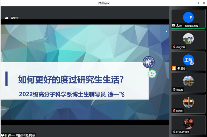 2022级博士班辅导员徐一飞老师对于同学们如何在机会与困难并存的新时代更好地度过研究生生活提出了3点建议。一是不忘初心。不忘科研的初心,体会科研和学习本身的快乐并牢记科研人员的使命和责任;二是学会沟通和换位思考。了解导师和同学对自己有着什么样的期待,思考自己能为身边的做些什么以及如何有效地与身边人进行沟通;三是平衡好科研和生活。学会合理安排工作时间,培养丰富的兴趣爱好以及厚植人文历史知识。