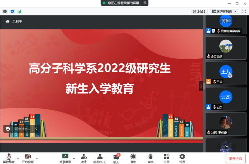8月29日,2022级硕士生班、2022级博士生班分别在化学-高分子楼B2085报告厅召开主题教育班会,会上还为每位研究生新生发放了系主任彭慧胜教授撰写的著作——《读研究生,你准备好了吗?》,鼓励同学们做好学习和生活的适应,为研究生阶段做好准备。各个班级在每位同学进行自我介绍后,又进行了班委竞聘投票、校纪校规介绍、新生活动安排等,帮助研究生新生尽快适应和融入成人tv 学习环境。