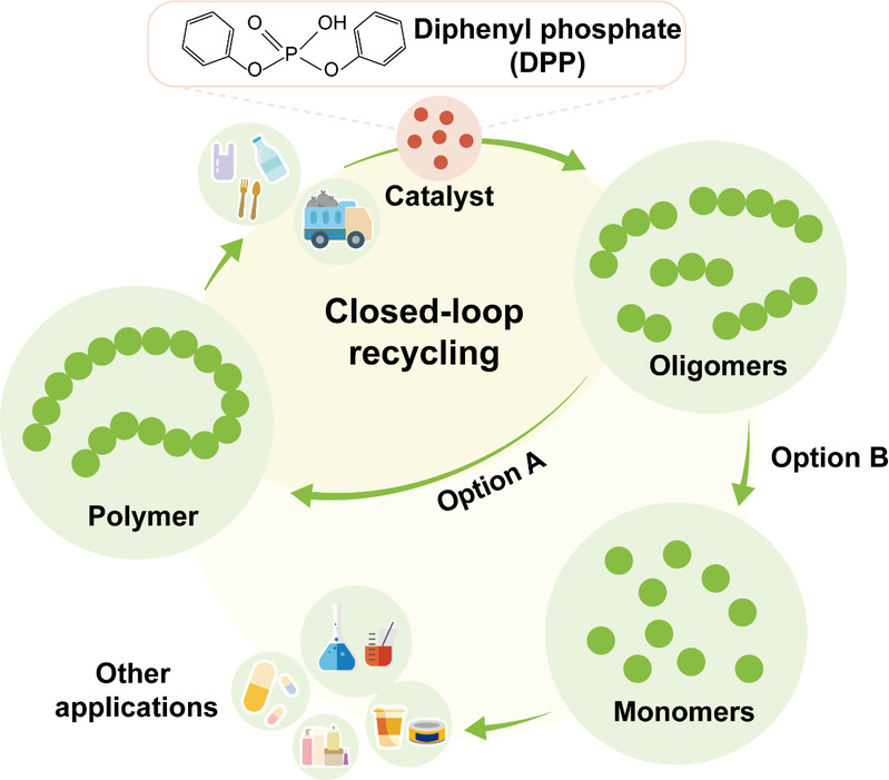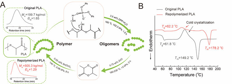 成人tv 俞麟教授首次将一种廉价的有机非金属化学物——磷酸二苯酯(DPP)用于加速PLA的水解并实现了材料的闭环回收。无需惰性气体保护、施加外部压力以及使用有机溶剂,仅在3.5 wt%的DPP和少量水的作用下,多种PLA工业粒料和市售产品在160 ℃下、1.5小时内可通过随机水解迅速转化为分子量不足500 g/mol的低聚物。具有酸碱双官能团的DPP在催化水解过程中可能起到了双重活化的作用,并且在重复使用10次后仍能保持良好的催化活性。通过调节反应体系中的水含量,还可将低聚物进一步水解得到与市售品品质相当且立体构型保持的乳酸水溶液。