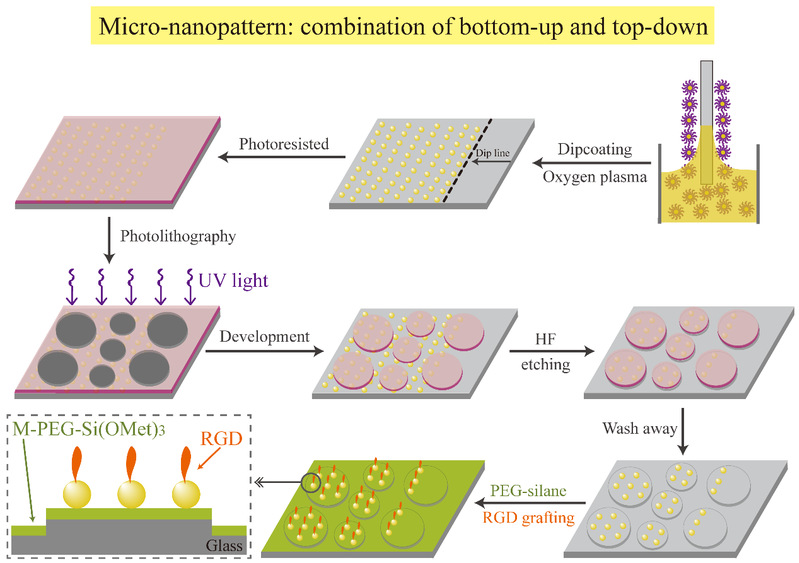The main stages to fabricate the micro-nanopatterns are schematically represented in Figure 2, where they combined block copolymer micelle nanolithography for nanopatterning, photolithography for micropatterning, and hydrofluoric acid (HF) etching. Then, an anti-specific adhesion background was obtained by salinization. Finally, arginine-glycine-aspartic acid (RGD) polypeptide was linked to prepare a series of RGD micro-nanopatterns with cell adhesion contrast (Figure 2 & 3).