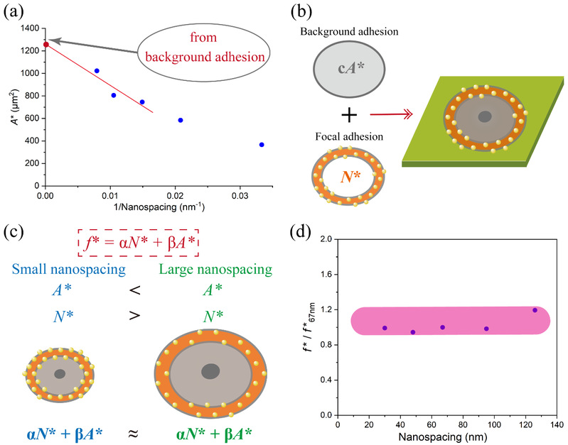 Figure 7 Derivation and schematic of nonspecific background adhesion of cells, and the calculated f* as a function of RGD nanospacing normalized to f* at 67 nm nanospacing.