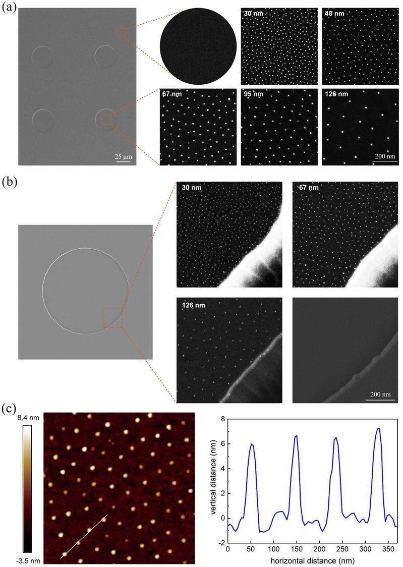 Figure 3 (a) FE-SEM images showing gold nanodots within the microislands (square images in the right column) and the background region outside the gold-nanodot arrayed microislands (round image in the right column); (b) FE-SEM images of a representative microisland (left column), the edges of gold-nanodot arrayed microislands of three micro-nanopatterns corresponding to three different nanospacings (right column), as well as the edge of an unnanoarrayed microisland on a micropattern as control; (c) Microscopic observations of nanopatterns by AFM.