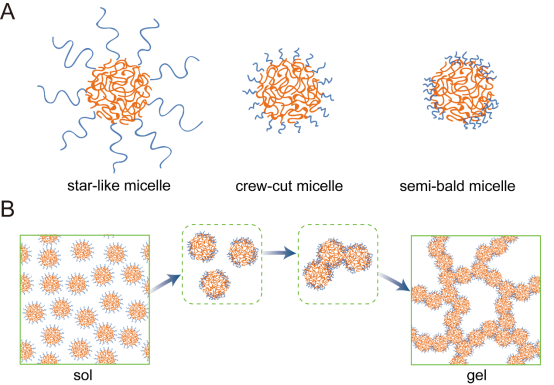 Based on experiments and computer simulations, Ding’s group revealed the intrinsic structure and the mechanism underlying thermogelling. The micelle at a low temperature might be a crew-cut one. With an increase of temperature, the corona collapses due to the reverse thermosensitivity of the relatively hydrophilic block PEG. If the collapsed corona in an original crew-cut micelle cannot totally wrap the core, a semi-bald micelle is formed. Owing to the hydrophobic property of the micellar core, the exposed areas of different micellar cores might contact to reduce the total exposed area, which promotes the aggregation. Then, a hydrophobic channel is formed and acts as a physical crosslinking point between semi-bald micelles. A thermodynamic sol-gel transition happens with occurrence of a percolated micelle network, which belongs, in light of statistical physics, to a percolation phase transition.