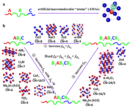 Prof. Qiu Feng’s group in the department of Macromolecular Science, Fudan University, published their recent work on the fabrication of a variety of mesocrystals by the self-assembly of designed multiblock copolymers on the Journal of the American Chemical Society on 14th February, 2014. In this paper, they proposed a new concept and dubbed it as “Macromolecular Metallurgy”, and accordingly proposed a universal design principle of ABC three-component multiblock copolymers for the fabrication of rich crystal structures in a mesoscale. Abiding by their design principle, their theoretical calculations predict more than ten mesocrystals, NaCl, CsCl, ZnS, AlB2, CaF2, Al2O3, and so on. This research makes a breakthrough of the block copolymer self-assembly into a variety of mesocrystals, which recasts the ionic or metallic crystals, and therefore brings more space for imagination to the applications of block copolymer self-assembly.