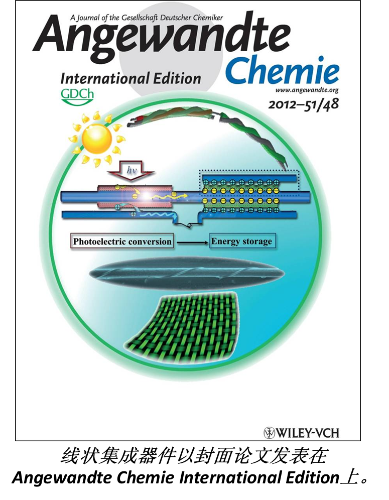 Prof. Huisheng Peng Group recently developed a novel soft linear integrated device with oriented carbon nanotubes as electrode, which could convert solar energy into electrical energy and store this energy. The total efficiency of photoelectric conversion and storage reached 1.5%. These results have been accepted by Angewandte Chemie International Edition (IF=13.5) and published online (DOI: 10.1002/anie.201207023). All the referees agreed that “it use a very simple and low cost method. This is the first demonstration of integrated energy generation and storage in a single wire”, “which is a critical step for the all-fiber textile energy systems” and “This matter indicates a novel and promising trend in the development of new generation photovoltaics”. This article was rated as a VIP (Very Important Paper). Only less than 5% papers could be viewed as VIPs, and this research was chosen as the cover story by the editor.