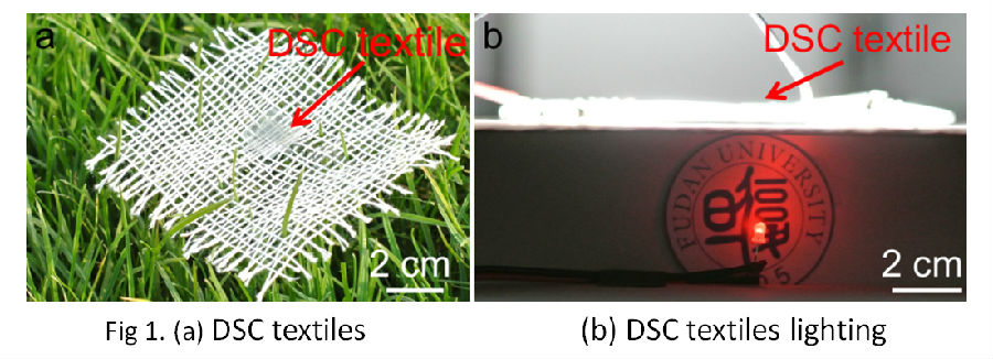 Prof. Huisheng Peng Group developed a new and general method to produce dye-sensitized solar cell (DSC) textiles, which could be easily integrated into various fabrics or other flexible structures (Fig. 1), by the stacking of two textile electrodes. This work provided a general method for the development of wearable energy electronic devices. The latest study was published online in the international authoritative chemistry journal Angew. Chem. Int. Ed. (//onlinelibrary.wiley.com/doi/10.1002/ange.201402561/abstract). This article was awarded as “Hot Paper”. At the same time, a special press release by “Wearable Solar Cells” was issued in Angew. Chem. Int. Ed. (//onlinelibrary.wiley.com/journal/10.1002/(ISSN)1521-3773/homepage/press/201418press.html). Peng’s Group obtained this special honor again since a special press release provided by Angew. Chem. Int. Ed. on the stretchable wire-shaped electrochemical supercapacitor in December 2013.